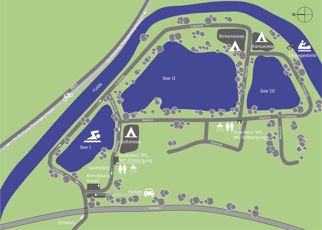 Der Campingplatz liegt im Ortsteil Obermelsungen direkt an der Fulda. Die Entfernung zur Melsunger Innenstadt beträgt ca. 2km.